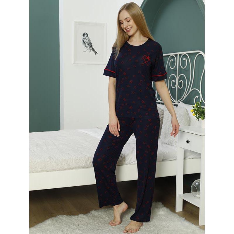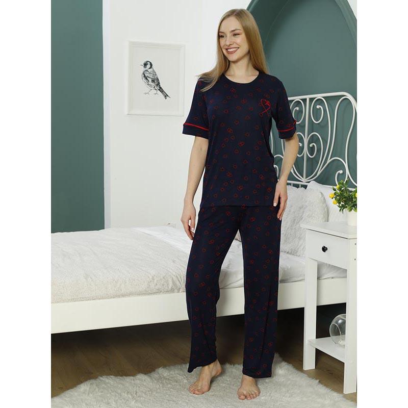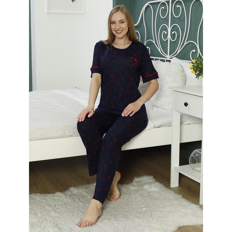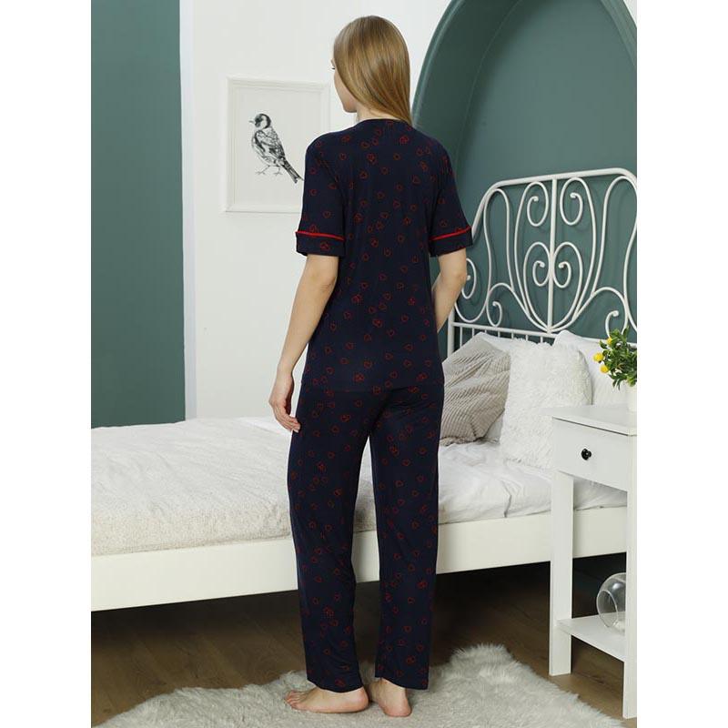 Bambu Yumuşak Kısa Kollu Lacivert Kırmızı Kalp İşlemeli Pijama Takımı, kaliteli bir ürün olmanın yanı sıra sürdürülebilir bir seçim de sunar. Bambu kumaşın doğal yetişmesi ve üretim sürecinde kullanılan az su miktarı sayesinde çevre dostu bir üründür.
